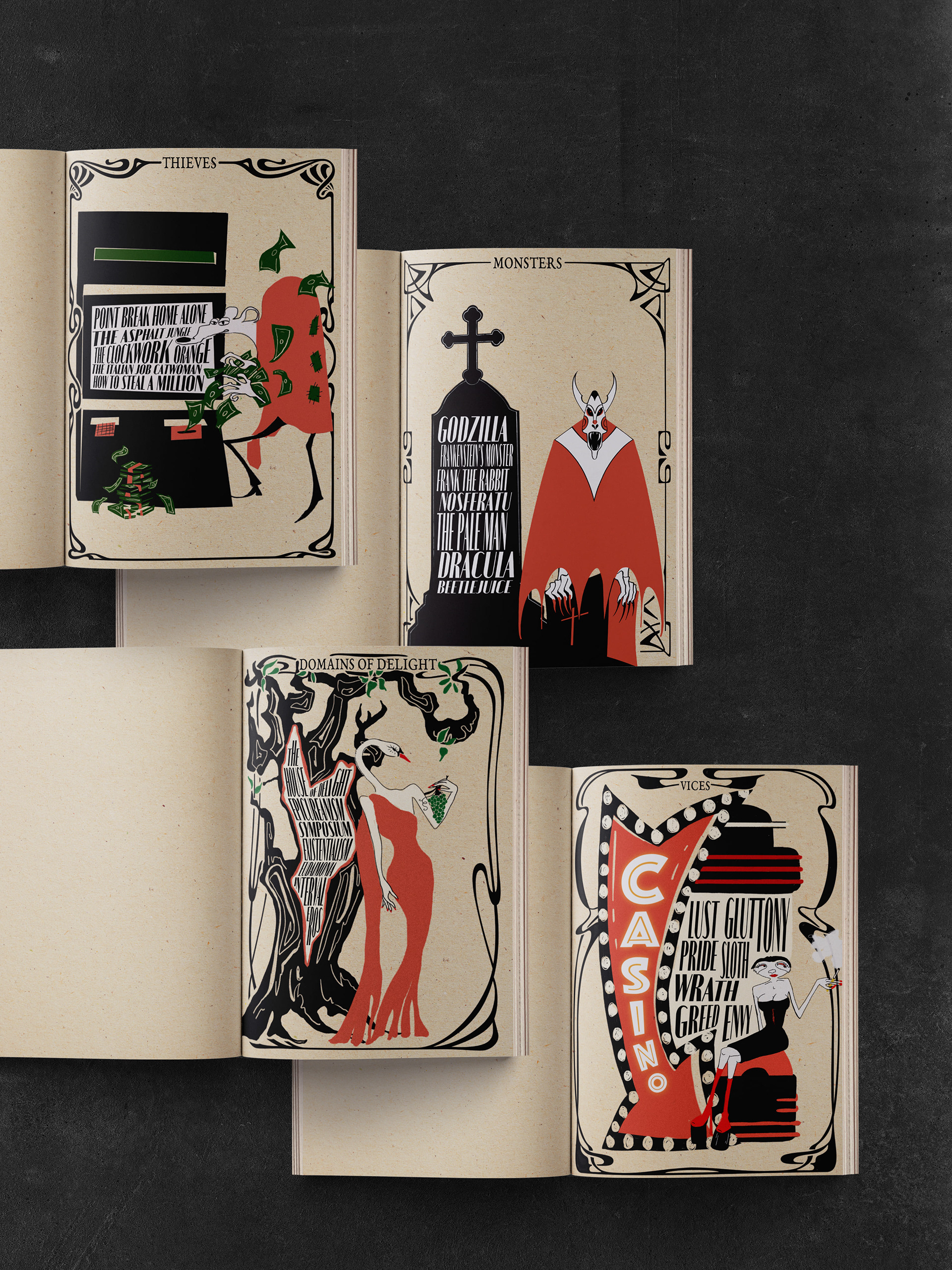 Illustrations Viktoria Lilova (Thieves), Lefei Chen (Monsters), Viktoria Lorup (Domains of Delight), Chiara Mesirca (Vices)